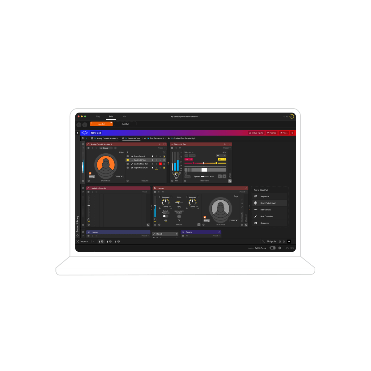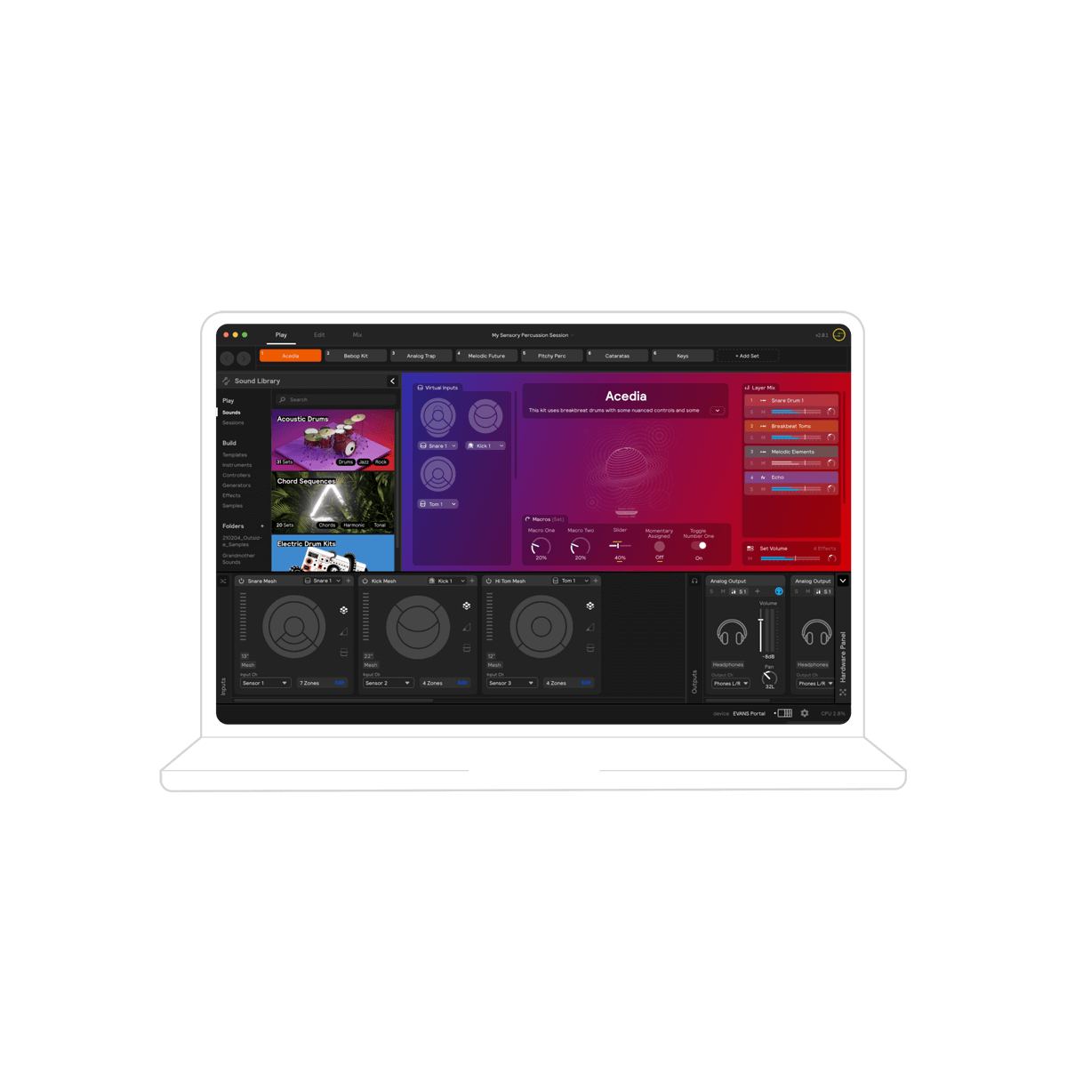 Powered by the Sensory Percussion 2 software, players gain access to deep layering, modulation, effects, and sample control. The software allows drummers to assign multiple sounds to different zones of a single drum, unlocking hybrid performance possibilities impossible with conventional electronic drum modules. It is designed for studio creativity, live production, and immersive electronic-acoustic integration.