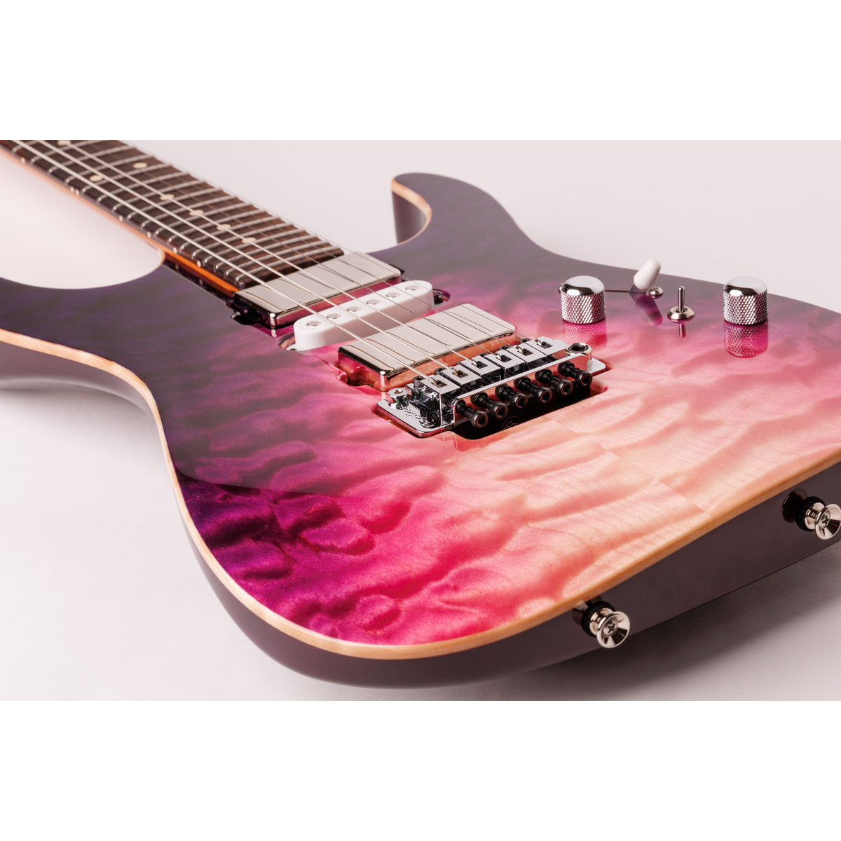Equipped with a recessed Baby Floyd tremolo, the Arc Angel delivers expressive vibrato, controlled pitch drops and stable return to pitch without compromising its resonance or sustain. The Buzz Feiten tuning system ensures accuracy across the entire fretboard, giving the guitar studio-ready intonation. Designed as a high-performance instrument with boutique tone and a show-stopping appearance, the Arc Angel Purple WakeSurf w/ Binding stands out as a top-tier choice for players who expect more from an electric guitar.